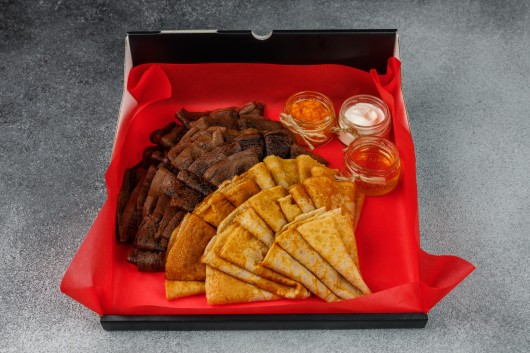 : блины шоколадные 15шт, блины гречневые 15шт, сметана, мед, апельсиновый джем