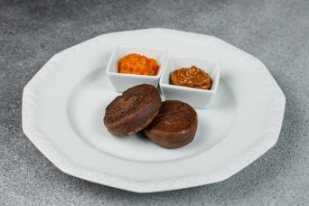 Сырники шоколадные с соусом "сникерс" и апельсиновым джемом
