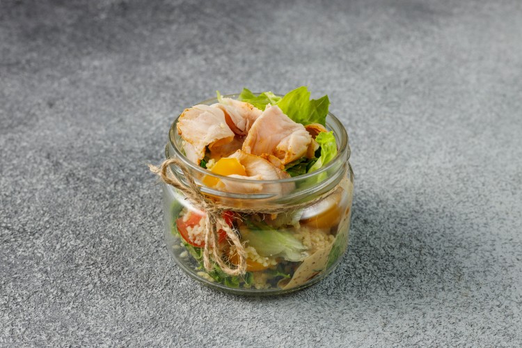 : Салат романо, филе индейки, помидоры черри, соус ореховый.